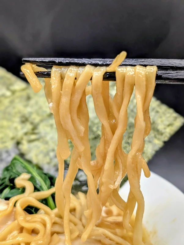 長さは約14センチと一般的な中華麺の半分くらいの短さですが、スープを拾いすぎず啜りやすい、家系のコッテリスープに合わせたベストな寸法となっています。