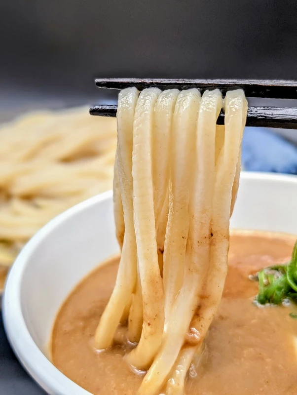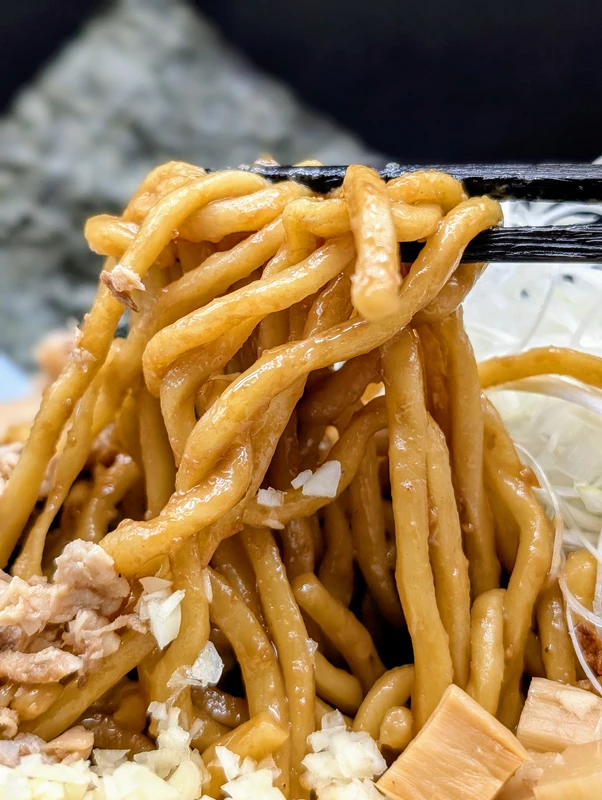 麺はややワイド型の自家製角刃極太緩ウェーブ。ボーメ度高めのゴツゴツとしたコシの強い、まさに武骨で屈強な食感が魅力の逸品。