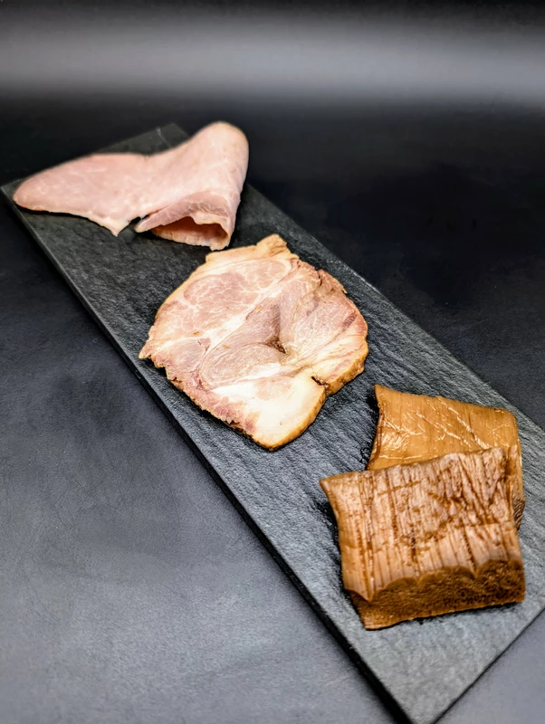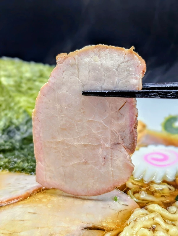 付属トッピングは味醂の甘味が効いたジューシーでゴリゴリ食感の極太短冊メンマが2枚、豚内モモのしっとりローストポーク、豚肩ロースの吊るし直火焼豚が1枚ずつ。