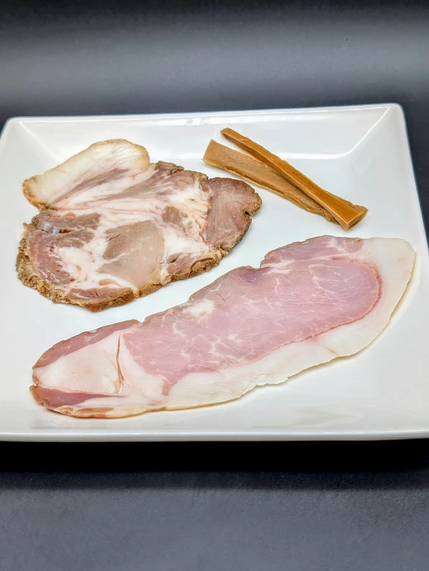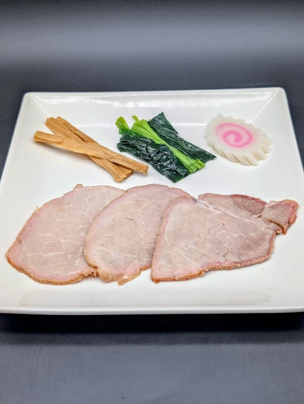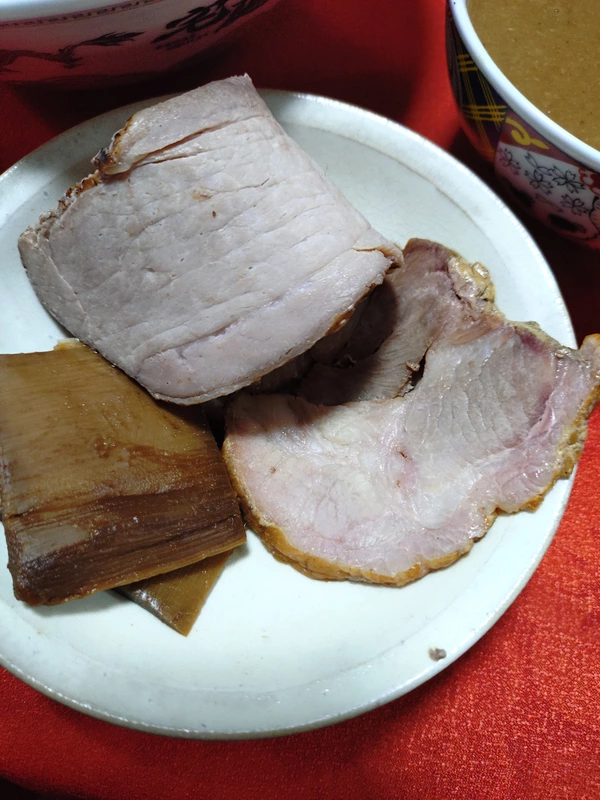 付属トッピングは豚ロースの低温調理レアチャーシュースライスと豚肩ロースの煮豚スライスが1 枚ずつ、そしてシンプルで雑味のないメンマが2本。