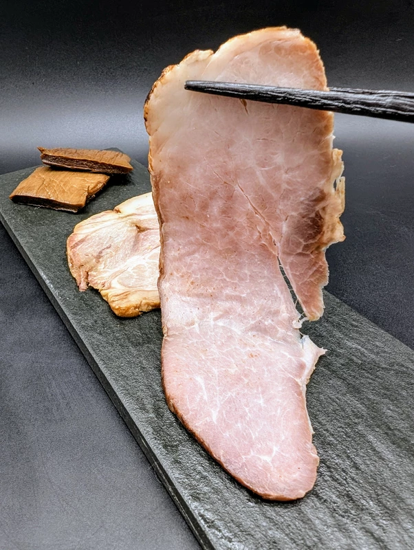 メンマはコク深くコリコリの食感で、チャーシューは楢炭でじっくり焼き上げた香ばしいモモスライス。湯煎だとギシギシに硬くなるので流水解凍がお勧めです。