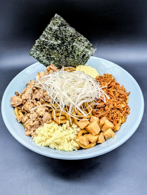 トッピングを乗せるのは麺とタレだけを混ぜ終えた後がよいです。そのほうが混ぜムラが無くしっかりと乳化します。