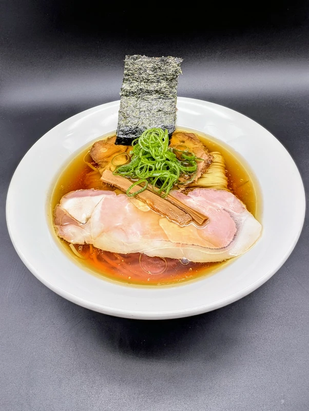 スープは完全無化調で、比内地鶏、TOKYO Xなどの国産ブランド鶏豚のガラと丸鶏を使用したクリアで繊細な淡麗清湯、