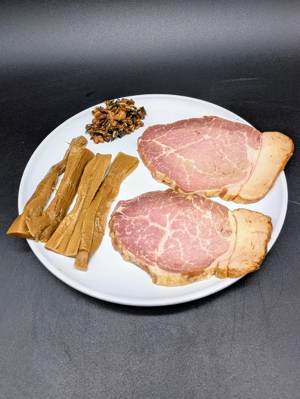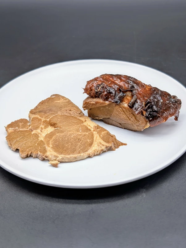付属トッピングのブタはスープと別パックで、約2cm幅、合計約130gものブ厚いウデスライスが2枚。