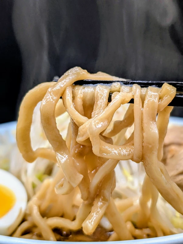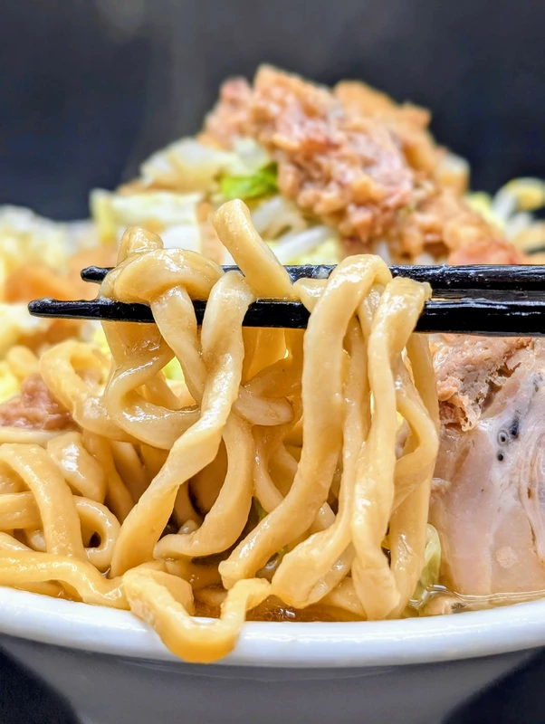 麺は自家製の平打極太縮れ麺。インスパ系にありがちなワシゴワの硬いタイプではなく、二郎直系のロット後半っぽい、ちょいヤワのモチプリ食感なあたりからも二郎愛を感じます笑