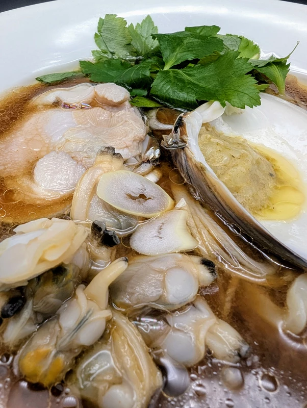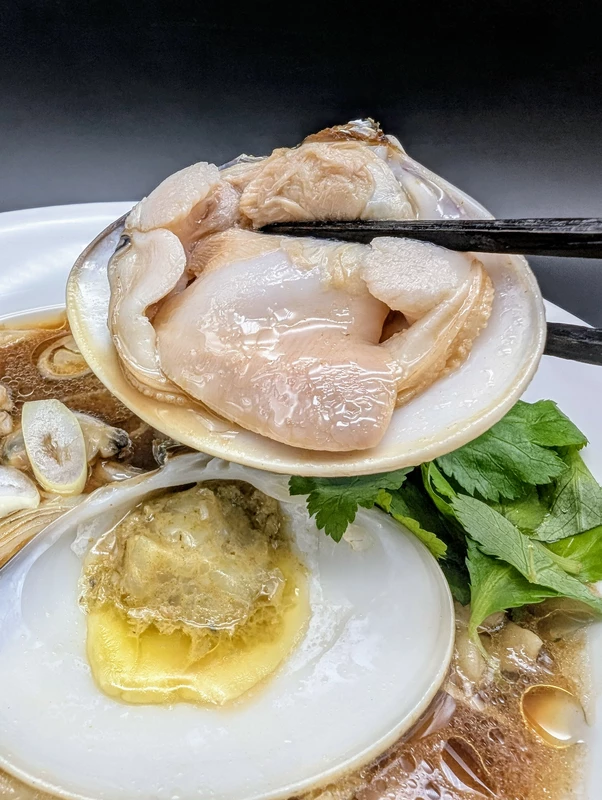 付属トッピングには殻付き蛤と浅蜊の剥き身があり、ハマグリは大粒でブリッブリな肉厚の紛れもない地蛤。