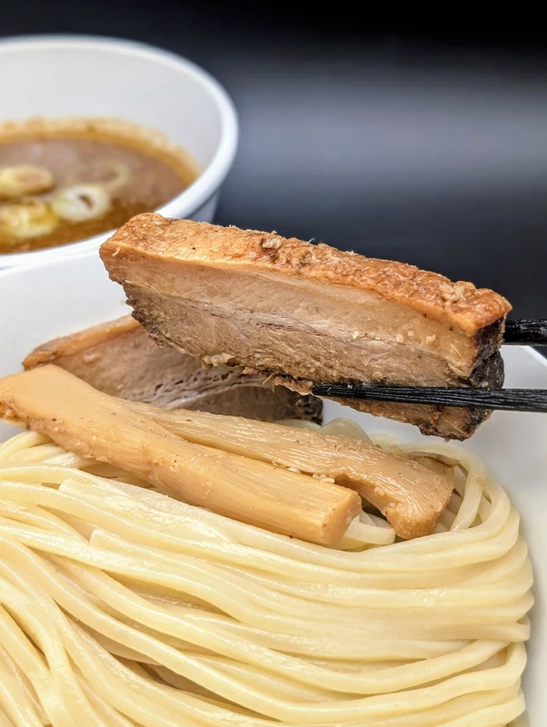 チャーシューは吊るし焼きされた霜降りの内ももスライス焼豚が2枚で、醤油麹の奥行きある甘みとスモーキーな香りが楽しめる逸品。