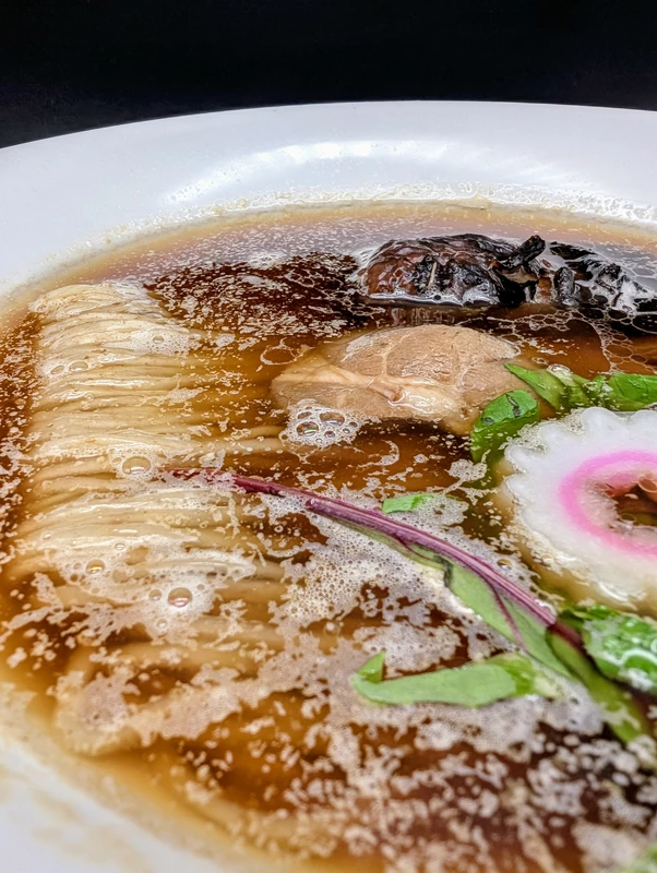 節と煮干と濃口醤油の芳ばしさやセロリの清涼感など芳醇な香りが特徴的で、表面には風味豊かな鶏油と豚背脂が適度に浮いています。