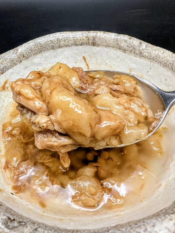 コラーゲンによるとろりと粘度のあるクリーミーな口当たりで、丼底に沈むガラと魚粉のザラつきもありますが、