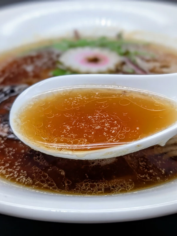 スープは富士丸特有の微乳化感がない非乳化タイプで、豚肉の旨味は良く出ていますが、富士丸よりも液状アブラが少なく、塩分濃度は約3.4%という海水と同じ超高濃度の反面、