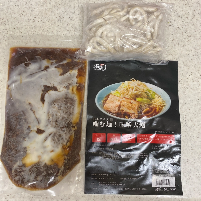 麺はワイド型の角刃太ウェーブ。本来はストレート麺かと思いますが、冷凍の影響か麺線が揃っておらずやや波打っています。