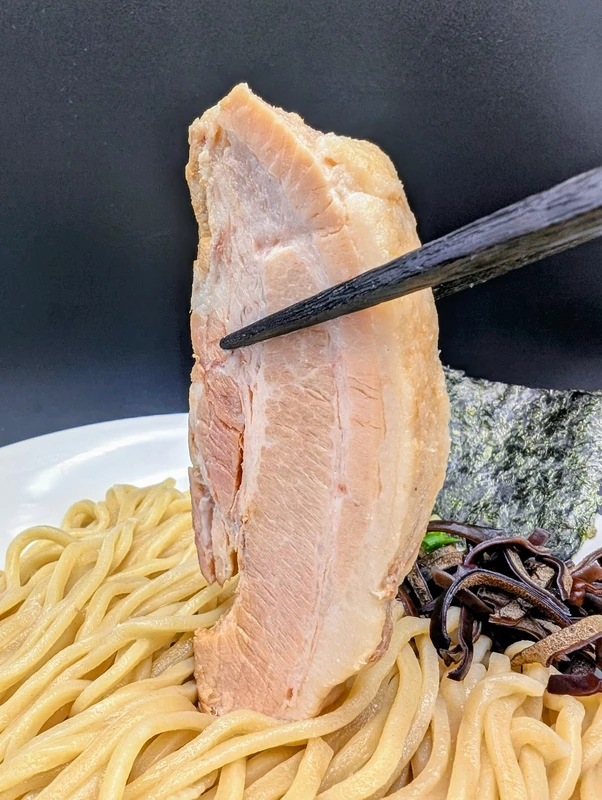 また、濃厚なドロドロつけ汁もちょっと付けて食べるだけでも美味しくなるし、とことん絡めて濃厚なのを味わうのもいいです。一緒に入っているチャーシューも脂身が少なくて食べ応えがある量が入っています。