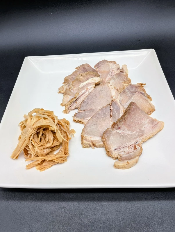 付属トッピングは千切りの細メンマがたっぷりで、チャーシューも豚ウデ肉のスライスが10枚とボリューム満点。