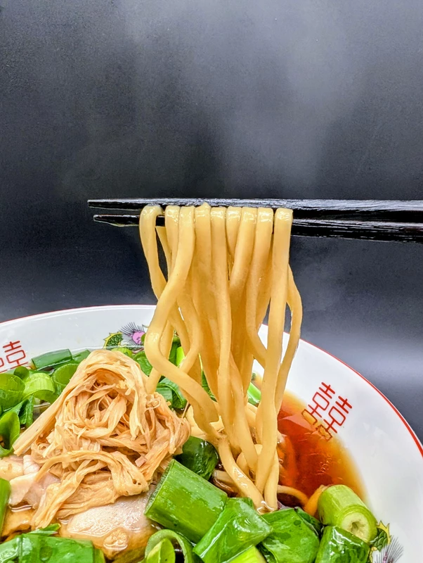 つるりとした滑らかな麺肌と、モチモチシコシコとしたコシの強さが濃口スープと見事にマッチし、抵抗なくスルスルと入ります。