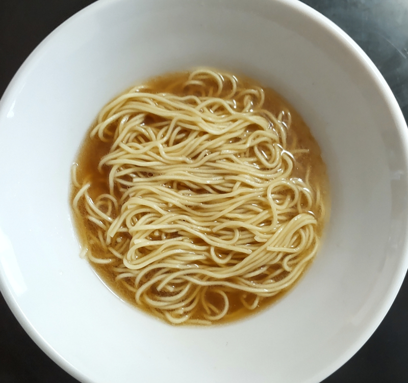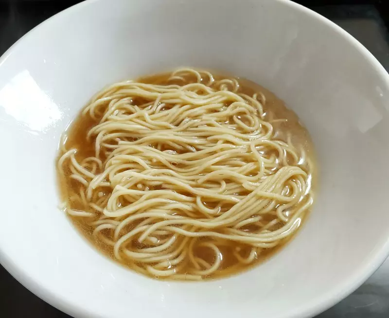 湯煎したスープの袋をよく振って乳化させると、カエシとスープのバランスが良くなってコクと旨味を楽しめる一杯に