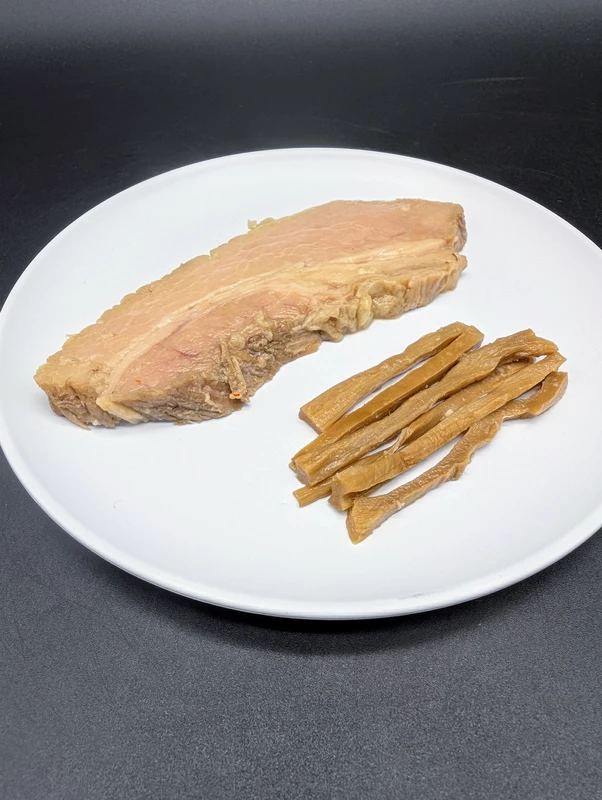 付属トッピングは豚バラブロックが1つで、実測(個体差あり)長さ約12cm、幅約5cm、厚さ約3cm、重量約140gもある大迫力のジャンボサイズ。