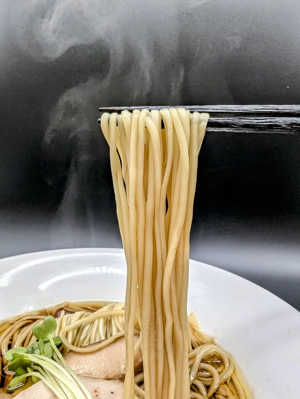 小麦の甘みが噛むほどに伝わり、しなやかでスープの吸い上げも良く、序盤はプリコリの強い弾力ながら、後半は一体感の増したモチフワの食感に変化します。