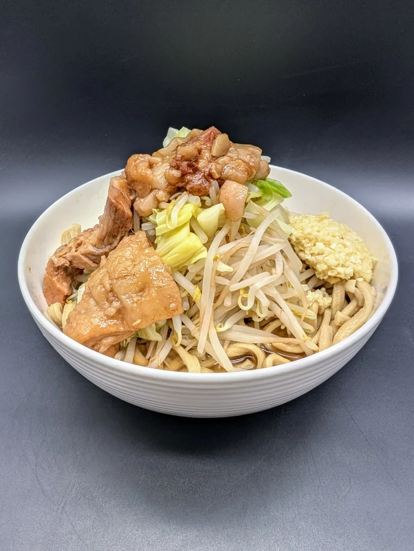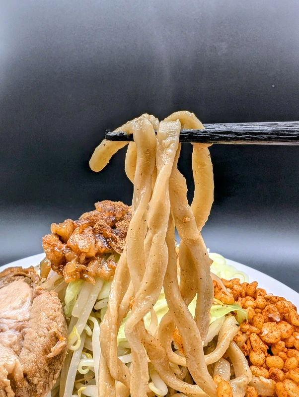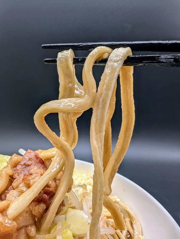 麺の味わい自体はNS系にも通ずるようなイメージもあり、二郎インスパの中では比較的加水率が低くなく、モチポクの食感が特徴的。