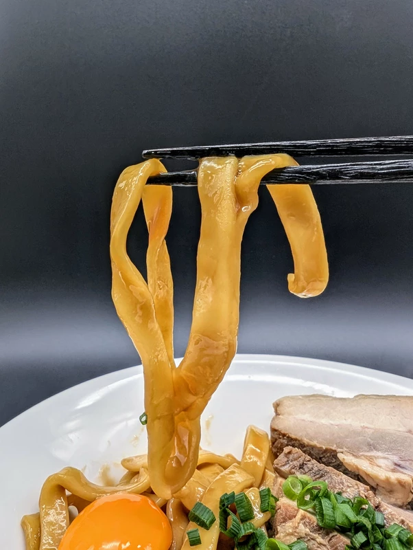 長浜や博多ラーメンの麺と同じ切刃番手の極細麺で、石臼挽きによるフレッシュな小麦感、ザラっとした麺肌と歯切れのよいコリパツの食感が噛むほどに楽しめます。