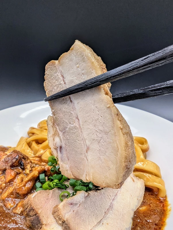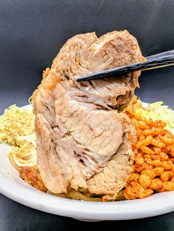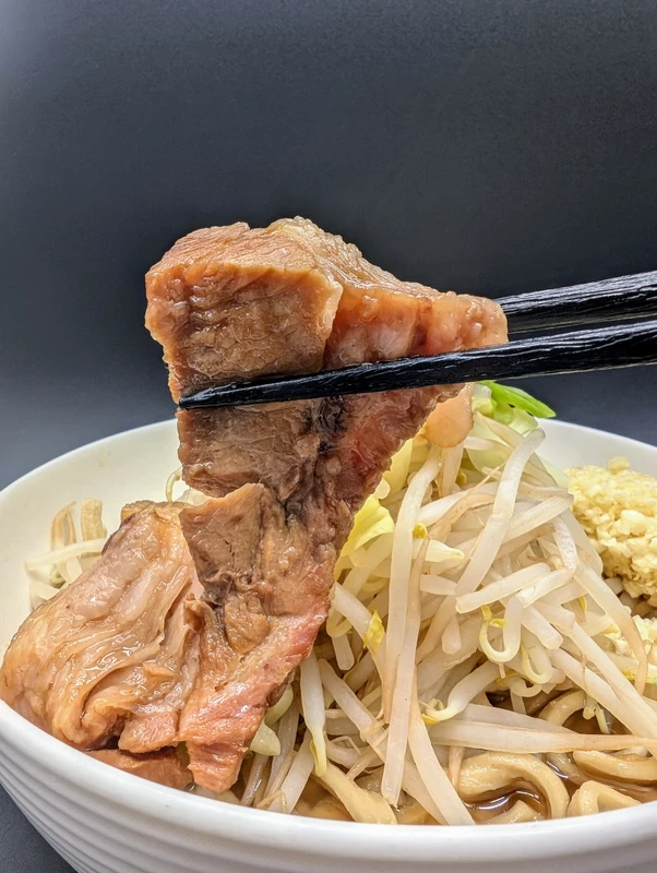 付属トッピングはズッシリと重量感のある豚バラ肉の厚切りチャーシューが3枚で、味付けはやや淡めですが、肉の旨味をしっかりと感じられるブリブリの噛み応え。