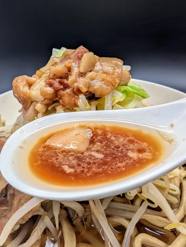 ゼンゼンもMEN YARD FIGHTも蓮爾登戸系のスープは甘じょっぱい濃口が特徴なので、麺やブタとの味のバランスを取る上でもヤサイは最低限乗せたほうがよいです。