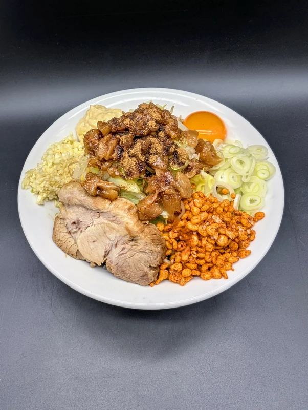 付属トッピングは辛揚げ(唐辛子をまぶした揚げ玉)と、分厚くカットされた大判のブタが1枚。