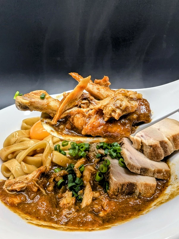 麺、カレーともに全体感として甘味が強めですが、甘味以外にもスッキリとした酸味とヒリヒリと刺すような辛さがあり、具材にはホロホロと崩れる骨付きの鶏手羽元が2本入っています。