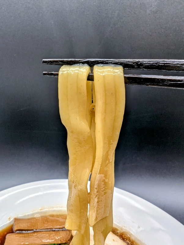 麺は茹で後の実測で横幅3.5cmもある超幅広な自家製超多加水手揉み麺。