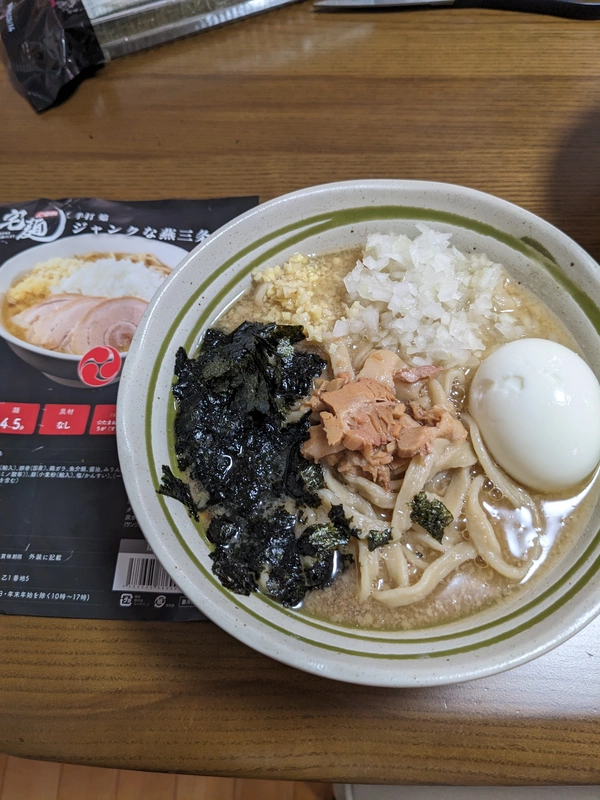チャーシューはスープに溶け込みバラバラのほぐし豚状態、これは残念。。麺は表記より1分長めに茹でましたが、ごわごわ感は健在。スープを飲むと、、まずしょっぱい、煮干はほんのり、想像していた燕三条とは違いました。玉ねぎは粗みじん切りのほうが良いと思います。