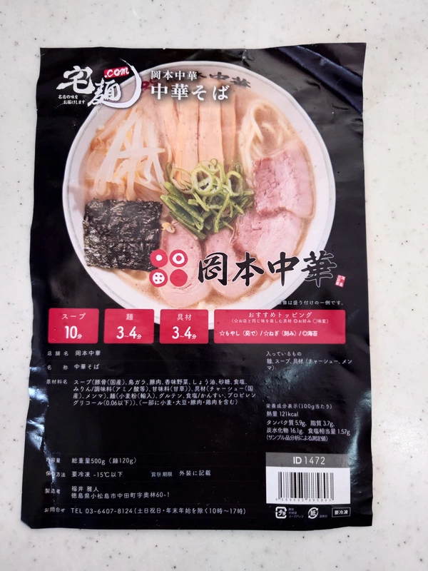 豚骨の香りが全面に出ていて、味は普通に美味しいパワフルな豚骨醤油ラーメンと言う印象。豚骨感が強く、醤油の割合が高そうな割には塩気は案外普通。そして一般的な家系と比べて鶏油が少ない。呼び戻し式のスープらしいのでカエシ以外の部分で濃厚系の博多豚骨とかと印象が近く、自分の中の家系のイメージ(武蔵家とか武道家)にあまり合わなかった。ネット上では濃厚さが武道家に近い、ような意見もありましたが鶏油の少なさなどから言って全くの別物だと思います。冷凍特有かもだが、燻製チャーシューは硬すぎ。また今回は初めての注文ですが、付属の海苔は黒よりは緑色に近い廉価なタイプでした。