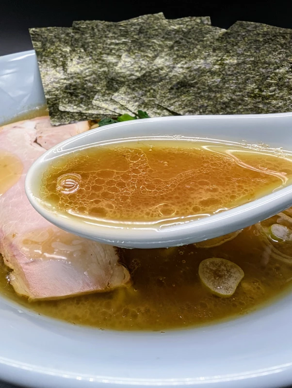 スープは豚と鶏の濃厚な豚骨醤油で、武蔵家のような粘度、ザラつき、ワイルドな獣っぽさはなく、洗練された熟成感とブ厚い骨太感があり、