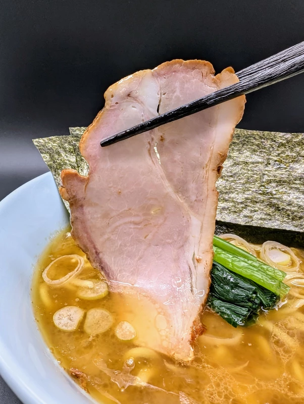 付属トッピングは国産三元豚のモモ肉を使った窯焼燻製チャーシューが1枚。