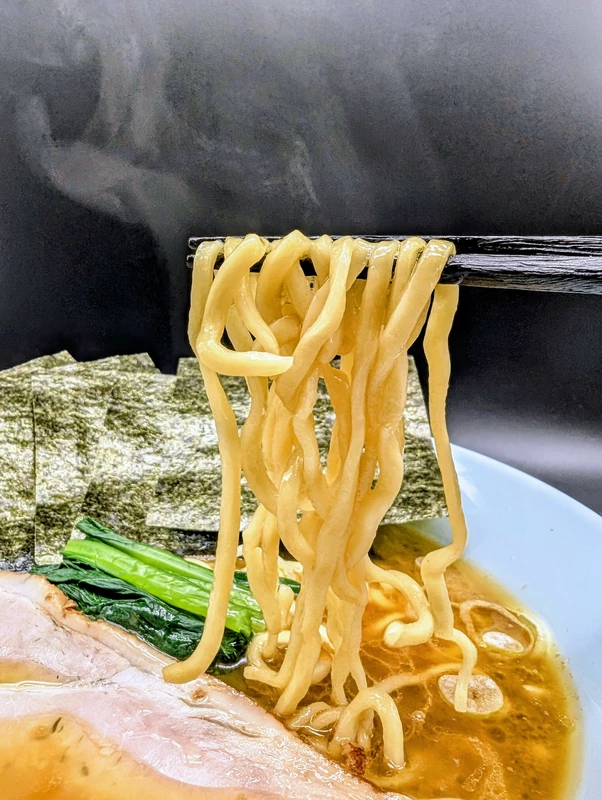動物魚介混合系スープも、程よいこってり感でツルツルとした細麺に良く絡む。