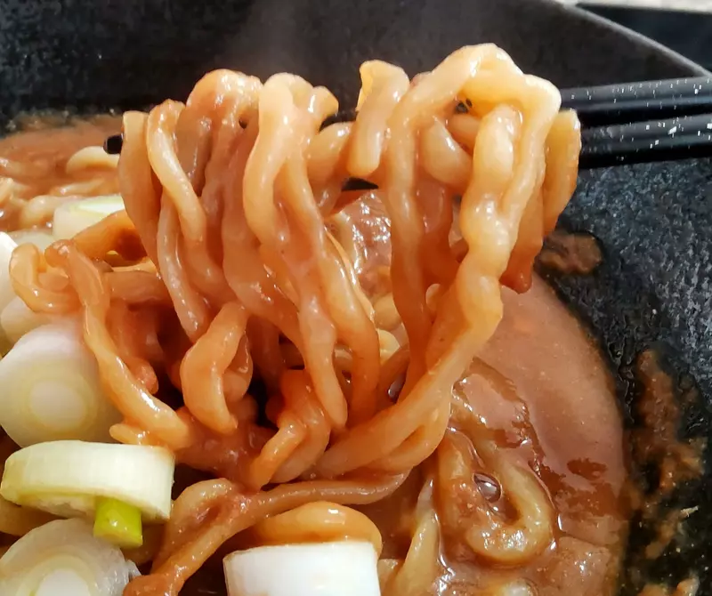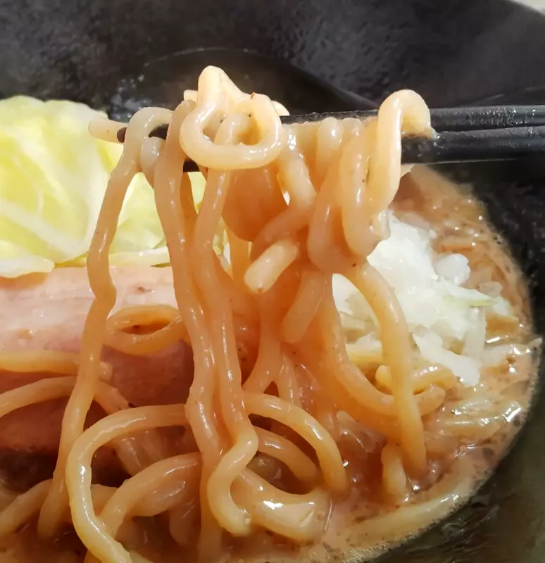 麺肌に凹凸がありスープの絡みと吸い上げが良く、オーション感の伝わるモチポクのやや軟らか目な食感は二郎直系に似たイメージ。