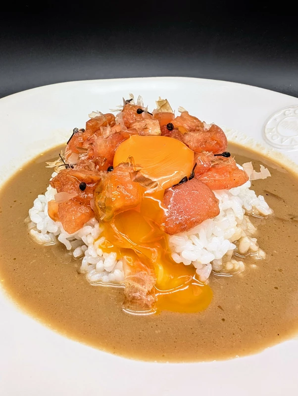 甘酸っぱいトマトソースがスープの塩味、鰹節の旨味、黒胡椒の刺激、卵黄のまろみと相まって、個性的な味わいを生み出す斬新なライスボウルとなっています。
