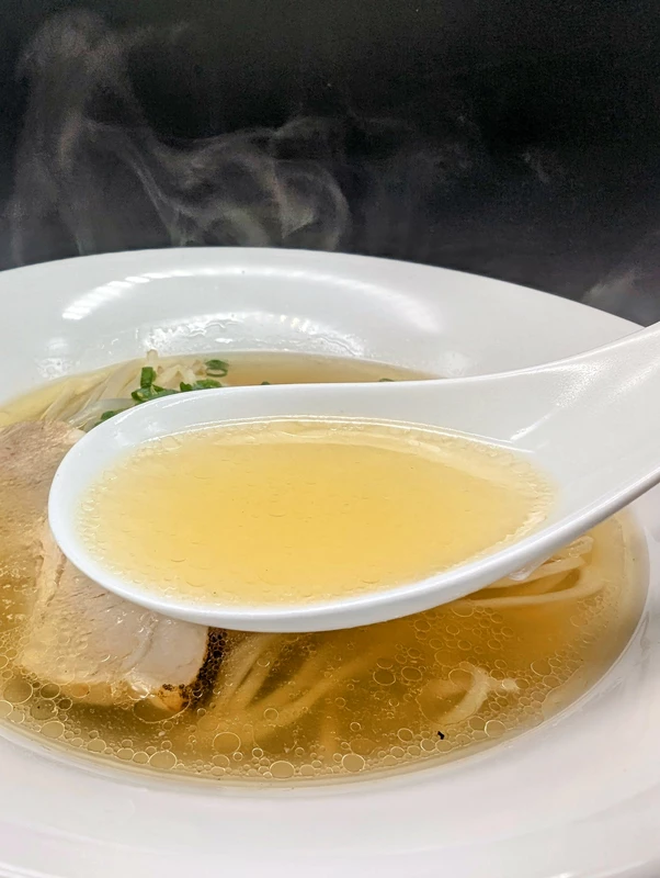 塩分濃度約1.5%、Brix値約3.9%と穏やかな味わいで、スープ表面にコラーゲンの膜が張るまろやかさとコクもあり、