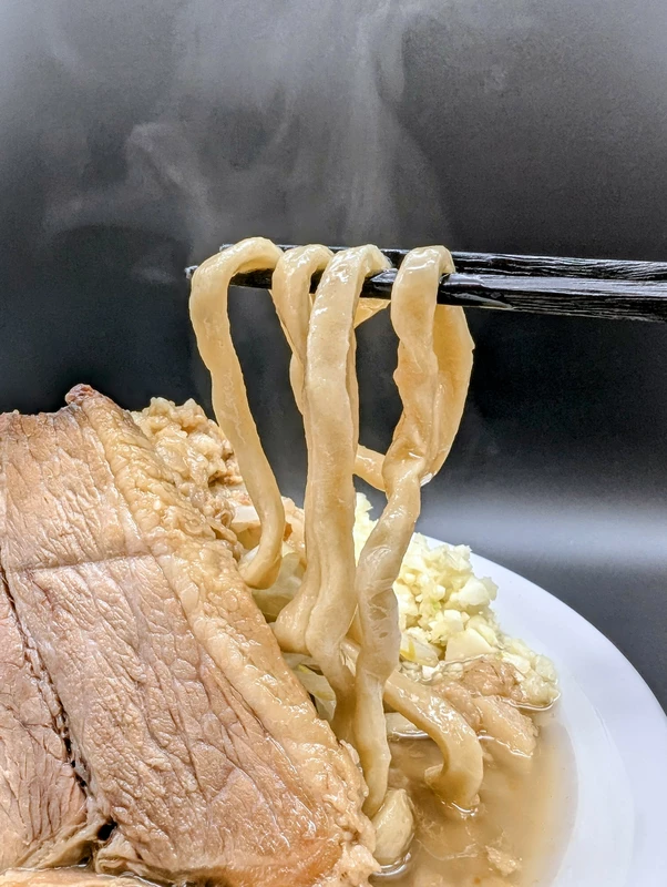 麺は松翔製麺という自社ブランド製のワイド型角刃極太乱捻れ麺で、使っている小麦粉は二郎系定番のオーションではありませんが、