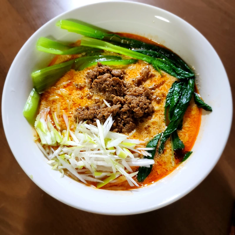 辛さは控えめで辛いの苦手な人でも食べやすい味。とにかくクリーミーで濃厚な味わいで、はなの奥にゴマの芳醇な香りが抜けます。思わず最後にご飯をインしてしまいました 笑。クリーミー系の担々麺が好きな人は是非食べてみてください。(写真の小松菜とネギはセルフトッピングです)