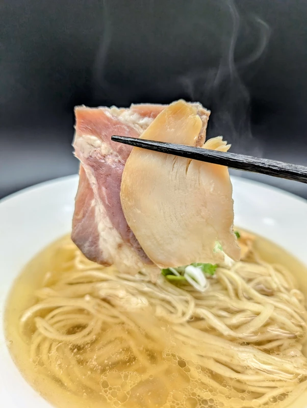 付属トッピングはミディアム食感の太メンマが2本に、豚肩ロースと鶏胸肉の低温調理レアチャーシューが1枚ずつ。