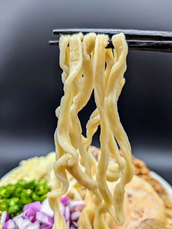 麺は自家製の中加水角刃平打極太ウェーブ。