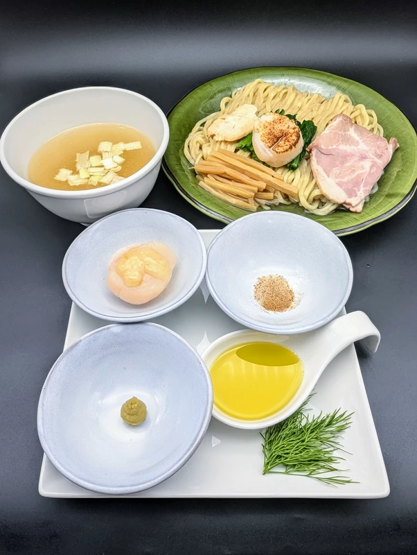 本品は麺、スープ、昆布水、豚肩ロースの低温調理レアチャーシュー、細切りメンマ、鰹塩、カルパッチョ用ソース、ほたて貝柱が1つ1つポーション分けされています。
