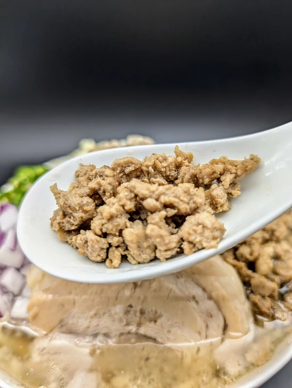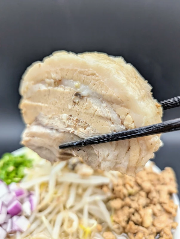 付属トッピングは豚ミンチと、Inスープのブタが1枚&青唐輪切り少々。ブタはホロリと軟らかい厚スライスのバラロールとなっています。
