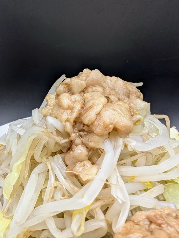 重量感のあるズッシリとしたビッグサイズで、赤身部分も箸で切れるくらいに軟らかく、ヤサイが捗る濃い目の味付けとなっています。